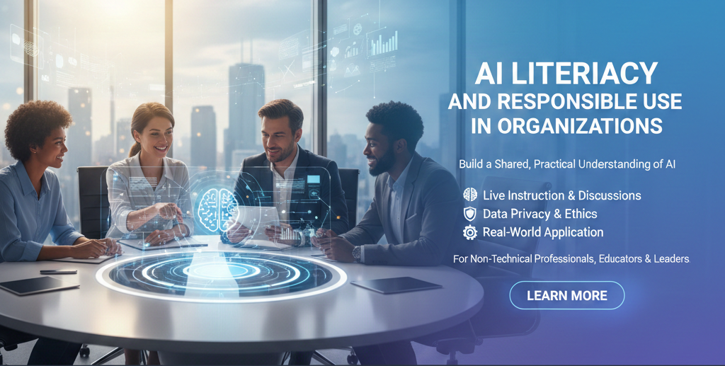AI Literacy and Responsible Use in Organizations is an instructor-led course designed to build a shared, practical understanding of artificial intelligence across corporate and educational environments. The course equips participants with the foundational knowledge needed to confidently engage with AI technologies while understanding their limitations, risks, and ethical implications.